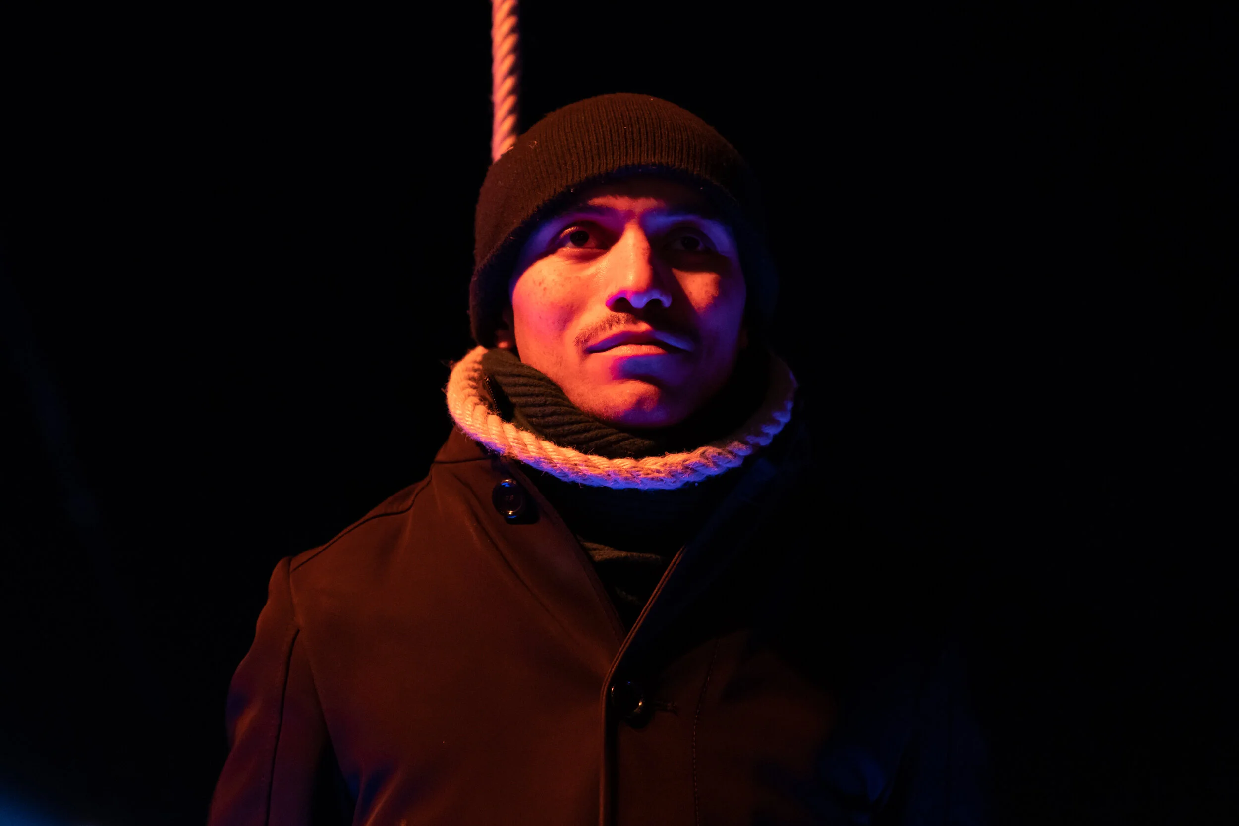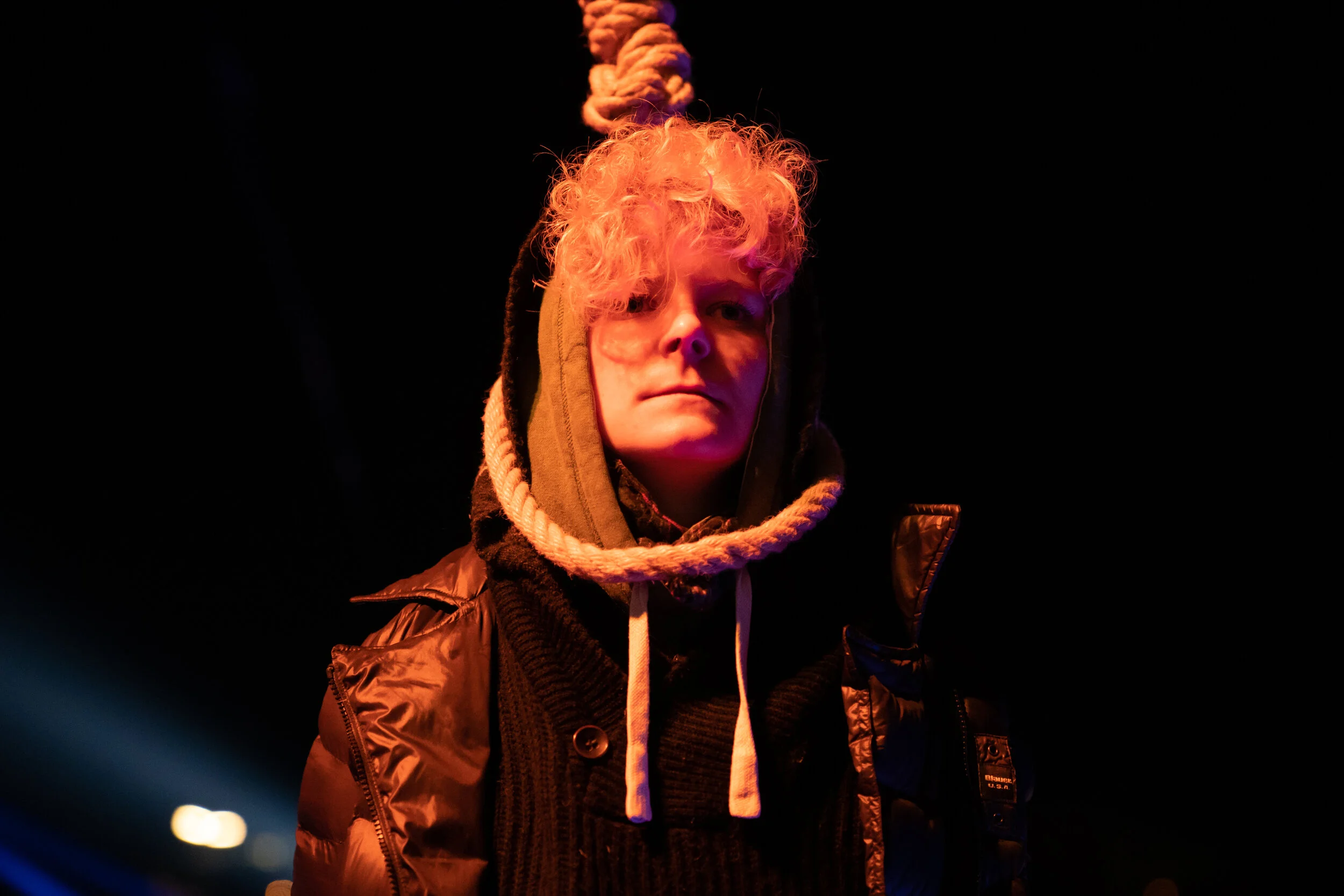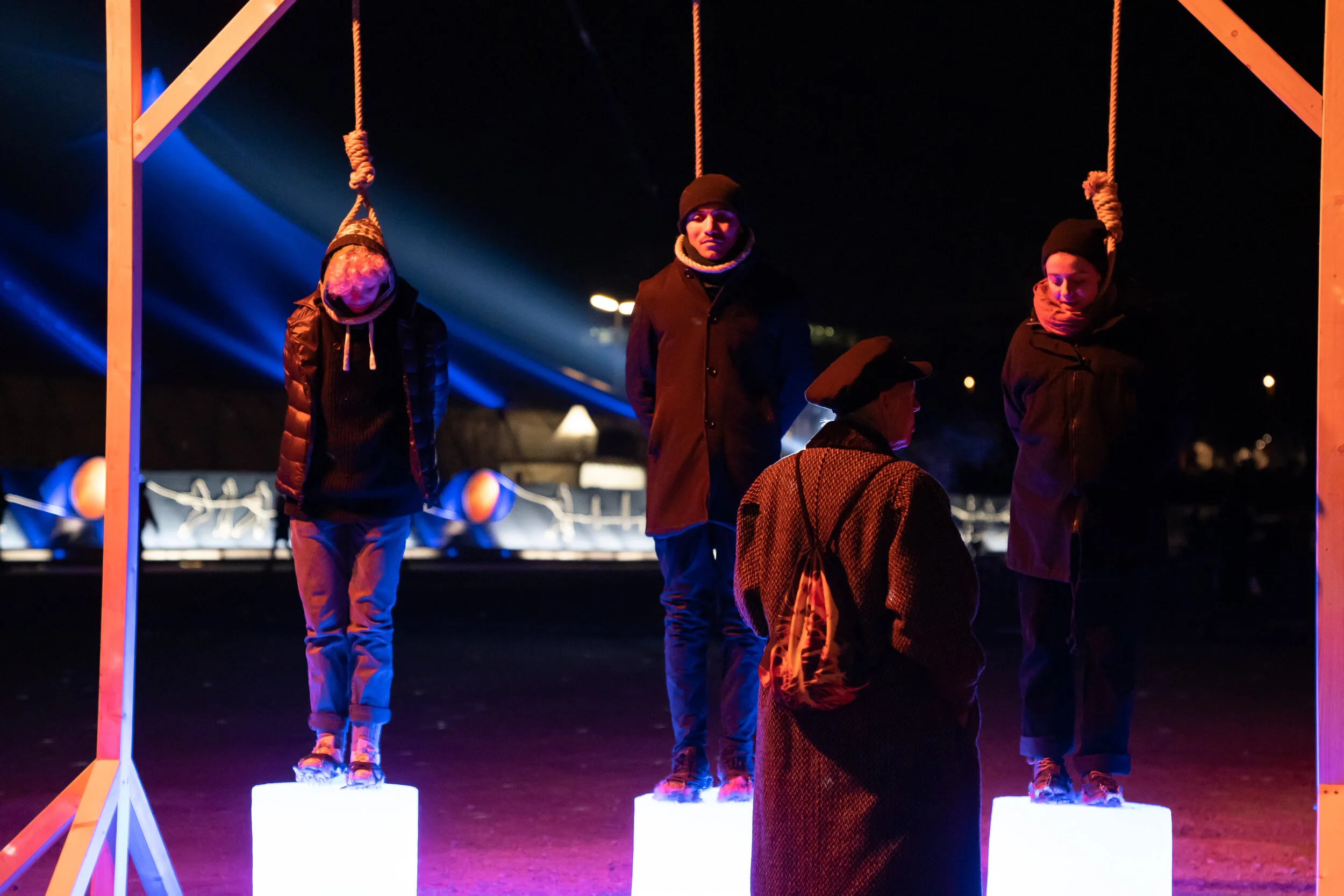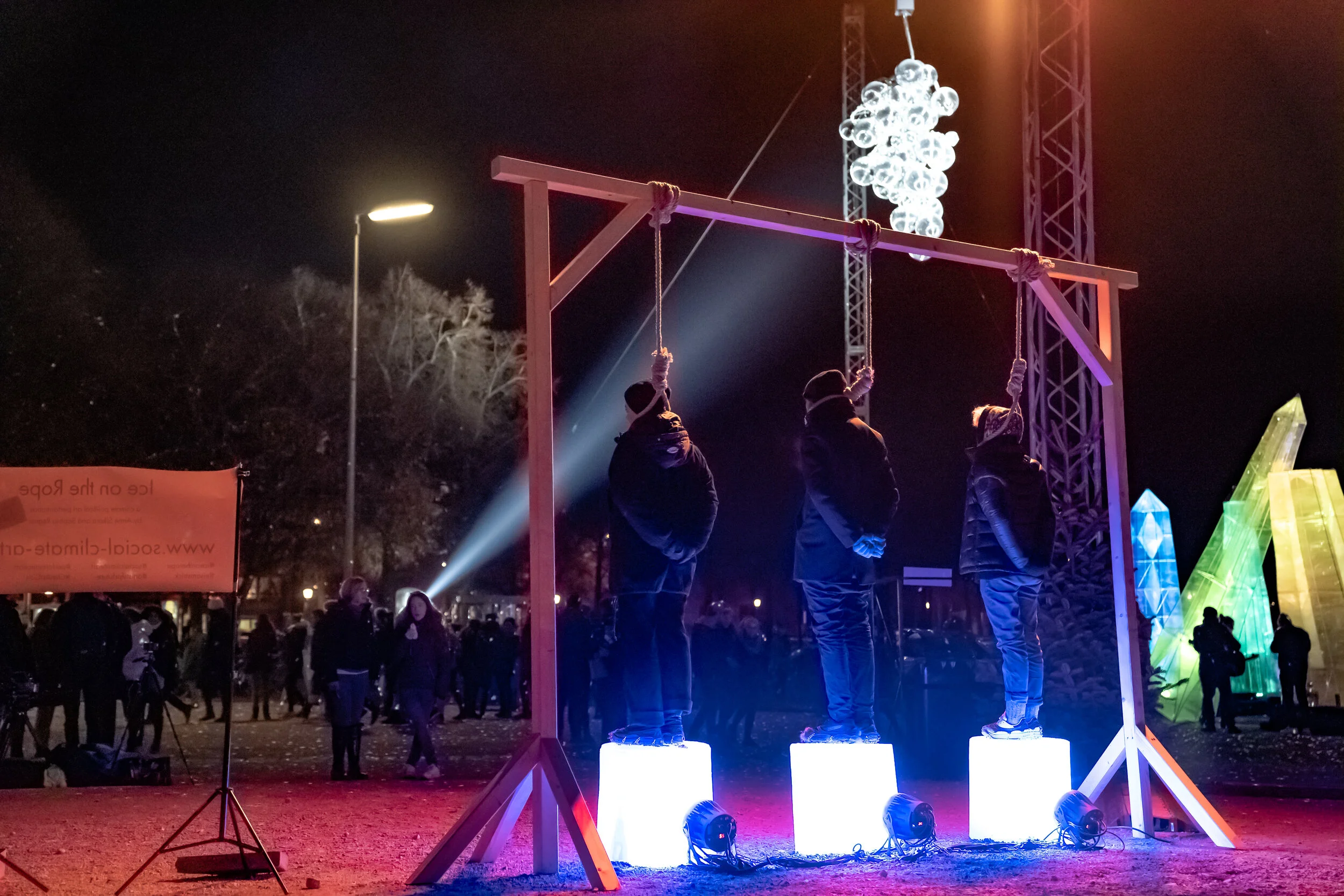 Drei Menschen auf schmelzenden Eisblöcken mit einer Schlinge um den Hals öffentlich unter einem Galgen. Ein Bild das schockieren und polarisieren soll, dem Konsumenten auf der Einkaufsstraße nicht ausweichen können. Ein klimapolitisches Statement welches auch an Politik und Wirtschaft gerichtet ist. Wichtig war uns die Komplexität des Klimawandels in einem simplen Bild auf den Punkt zu bringen.