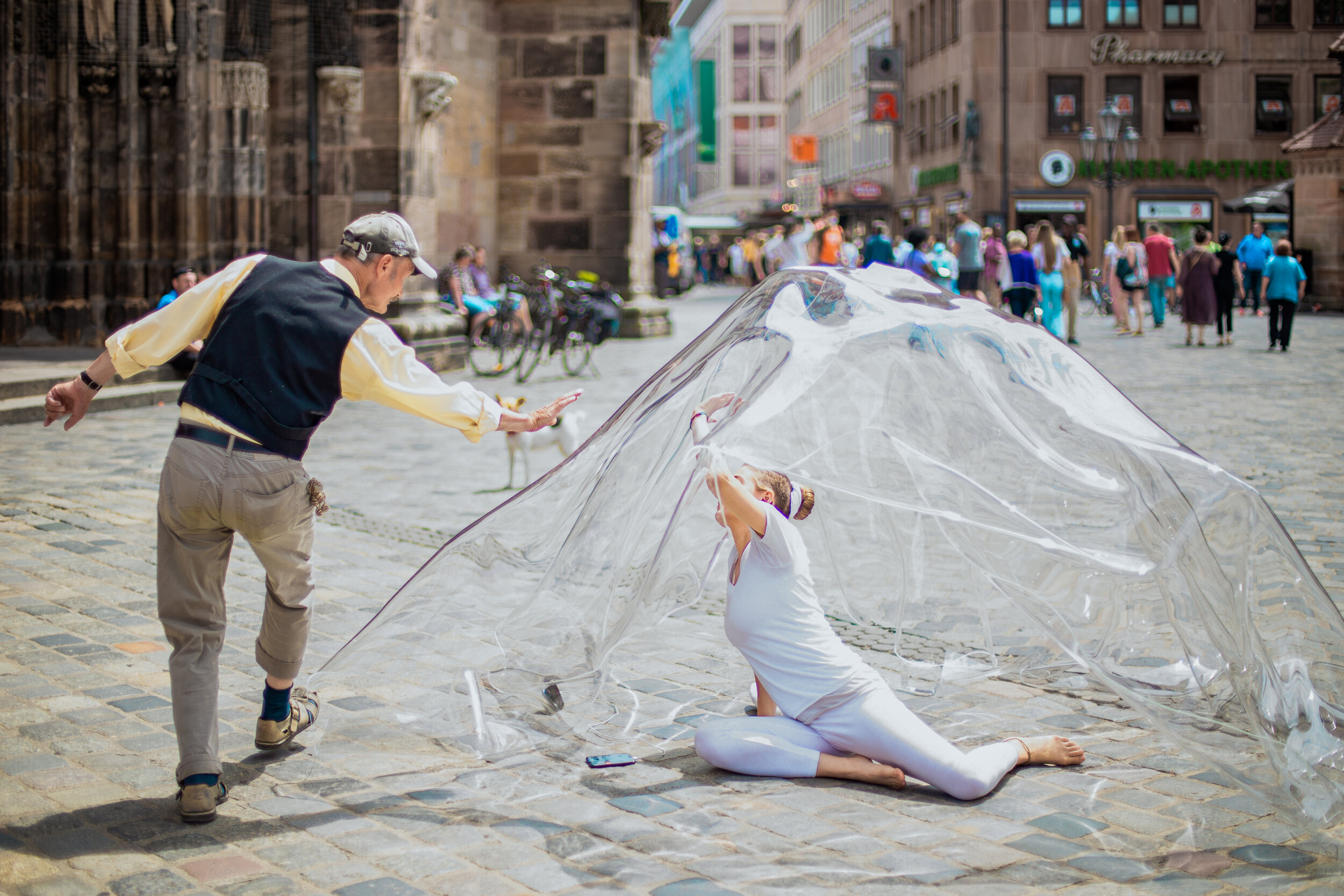 Mein Projekt „Transparent.“, thematisiert im Rahmen einer sozialen Plastik die komplexen Gefühle, welche ausgelöst werden können durch das NICHT Begegnen. Ohne Begegnung fehlt die Wahrnehmung des inneren Kerns des Anderen. Menschen, (welche soziale Schwächen aufzeigen) sind oft isoliert und gesellschaftlich ausgeschlossen. Die Begrenzung des sozialen Umgangs legt sich wie ein unsichtbares Tuch auf den Blick der Gesellschaft, welcher verformt und verfremdet, anstelle sich aufrichtig und klar zu begegnen. Die Plastik ist in Form eines transparenten Tuches aus zwei Kunststoffteilen gefertigt. Die Performance soll fokussieren, Diskussion auslösen und Begegnung. Im sich brechenden Licht der Skulptur spiegeln sich verzerrt Passanten. Die Perspektive, ein Querschnitt der Gesellschaft.